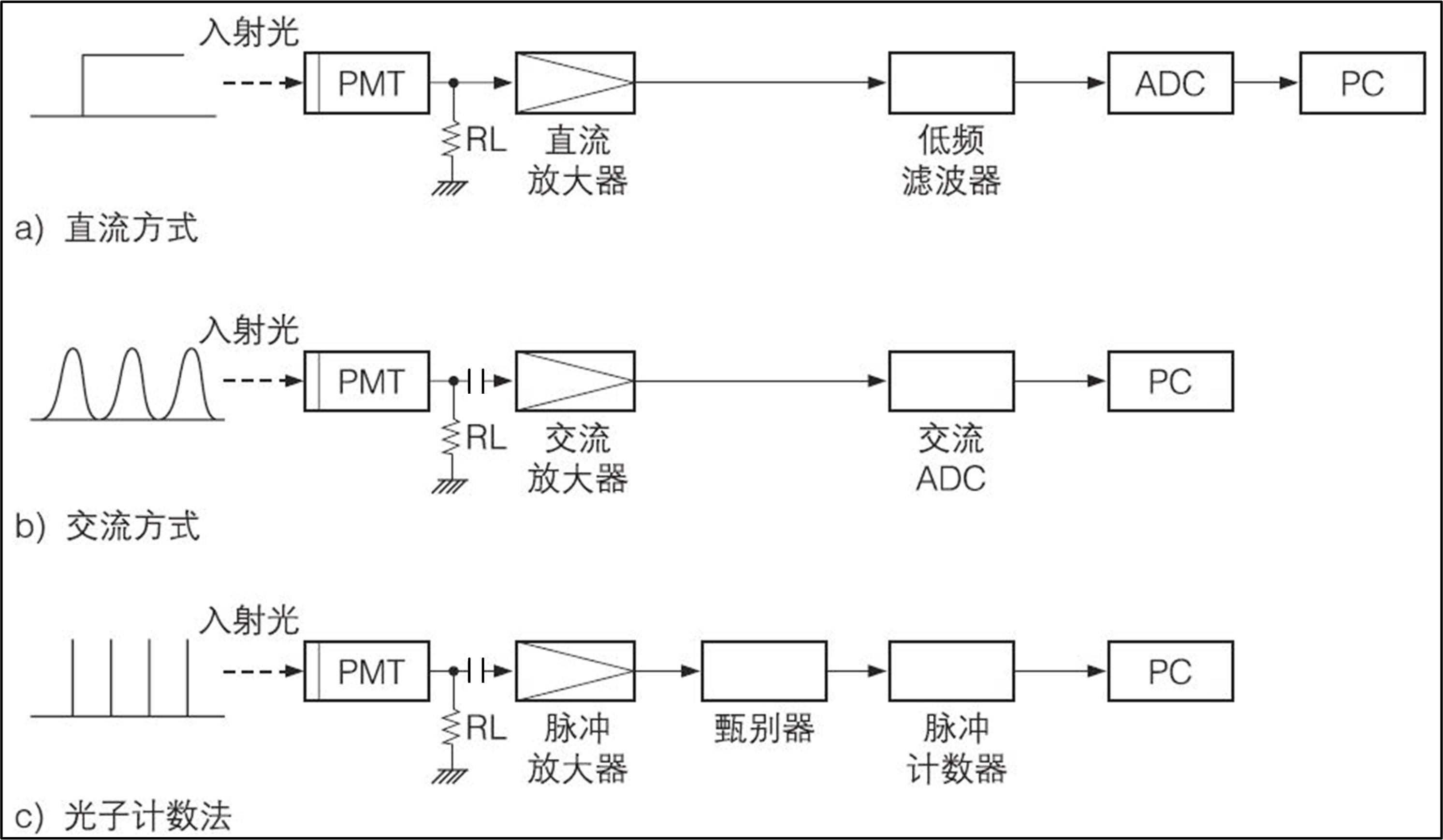 PMT連接分壓器和高壓便可從陽(yáng)輸出電流信號(hào),后續(xù)連接回路的設(shè)計(jì)根據(jù)入射光強(qiáng)的不同而有所區(qū)別,如圖5所示,其中a)直流方式,是將PMT的直流成分分別通過(guò)放大器、低通濾波器之后再進(jìn)行檢測(cè),該方法適用于探測(cè)光強(qiáng)相對(duì)較強(qiáng)的情況,且使用較為廣泛;b)交流方式,是將PMT的輸出通過(guò)電容器取其交流成分,再用平方檢波器將其變成直流成分進(jìn)行檢測(cè),該方法一般適用于光強(qiáng)較弱的情況,在此情況下,輸出信號(hào)中的交流成分壓制了直流成分而占主導(dǎo)地位;c)光子計(jì)數(shù)方式,是將PMT的輸出脈沖先放大,再經(jīng)過(guò)脈沖幅度甄別器進(jìn)行選擇,然后對(duì)幅度在某一甄別電壓之上的脈沖進(jìn)行計(jì)數(shù),該方法適用于觀察從PMT輸出的脈沖是離散的情況,因此其在微弱光探測(cè)領(lǐng)域即單光子領(lǐng)域是一種非常有效的方法。