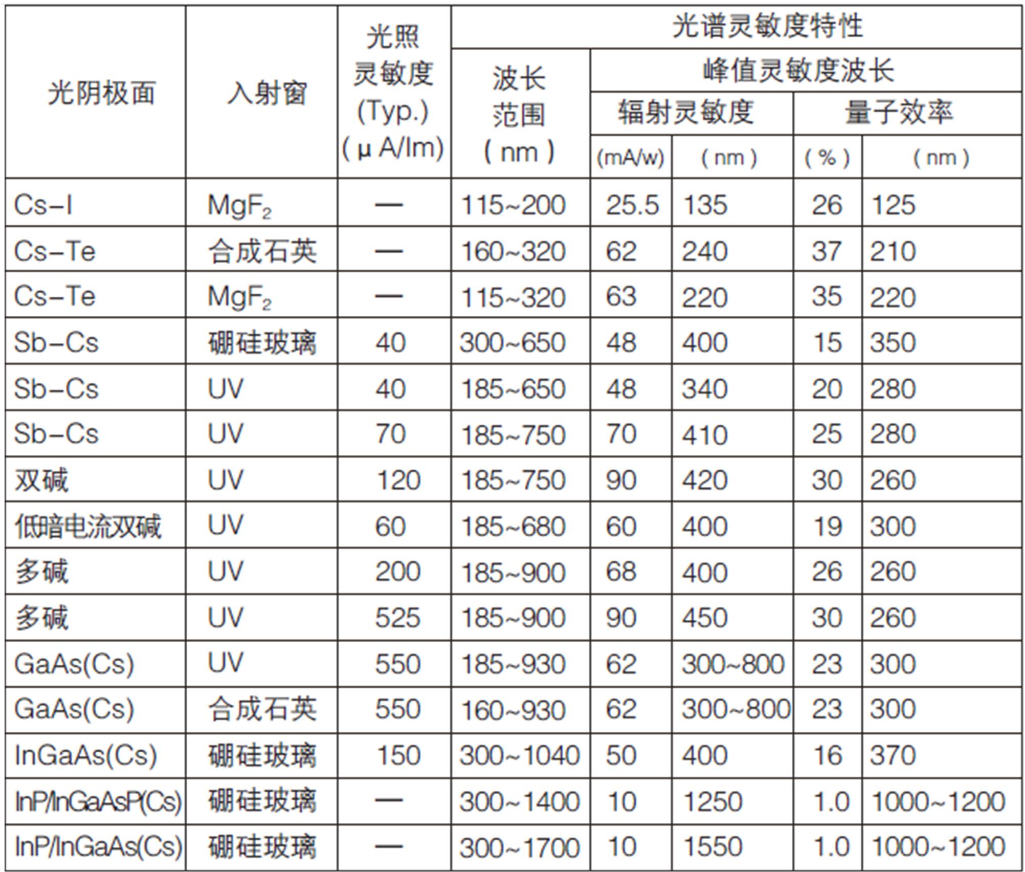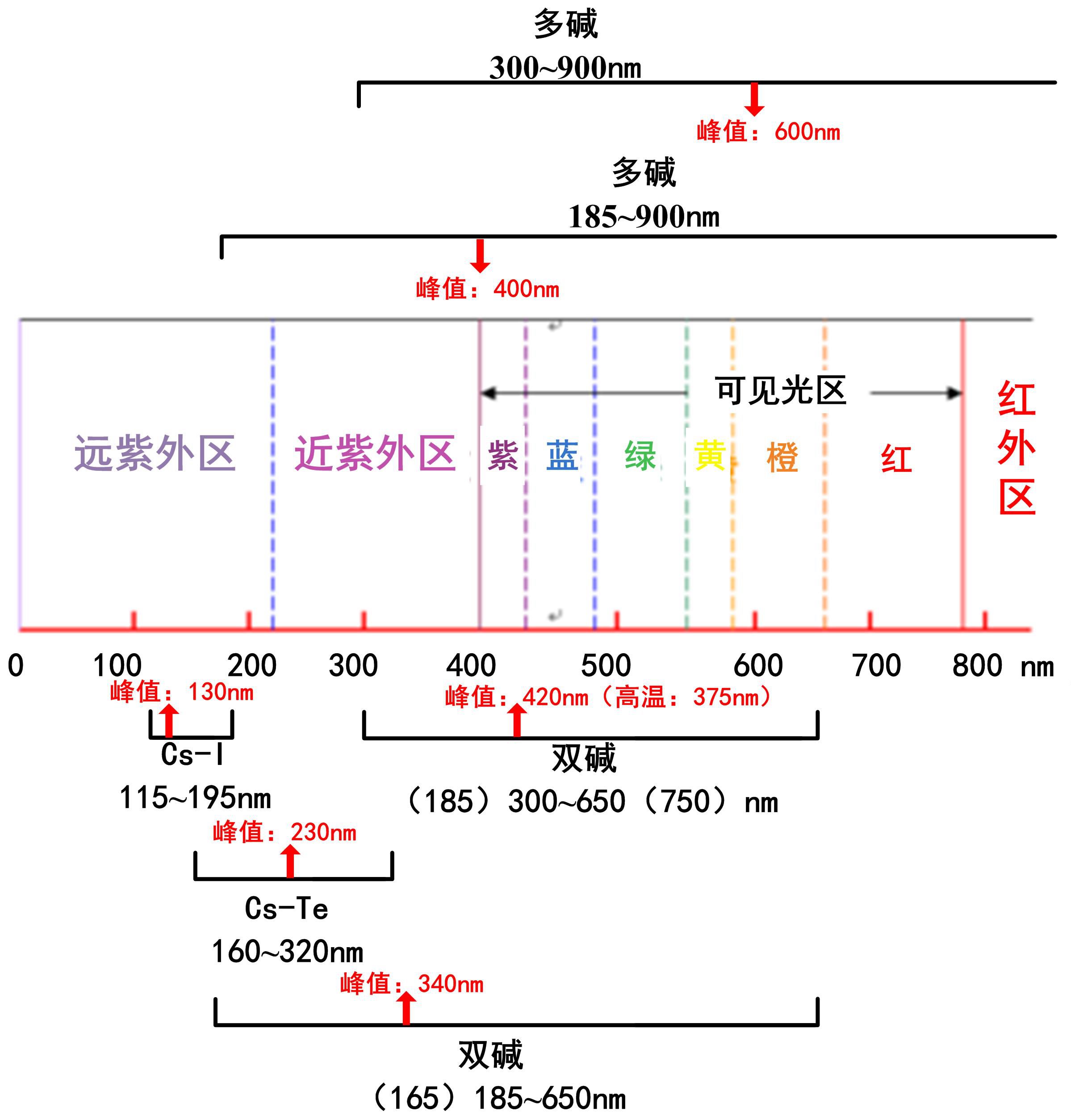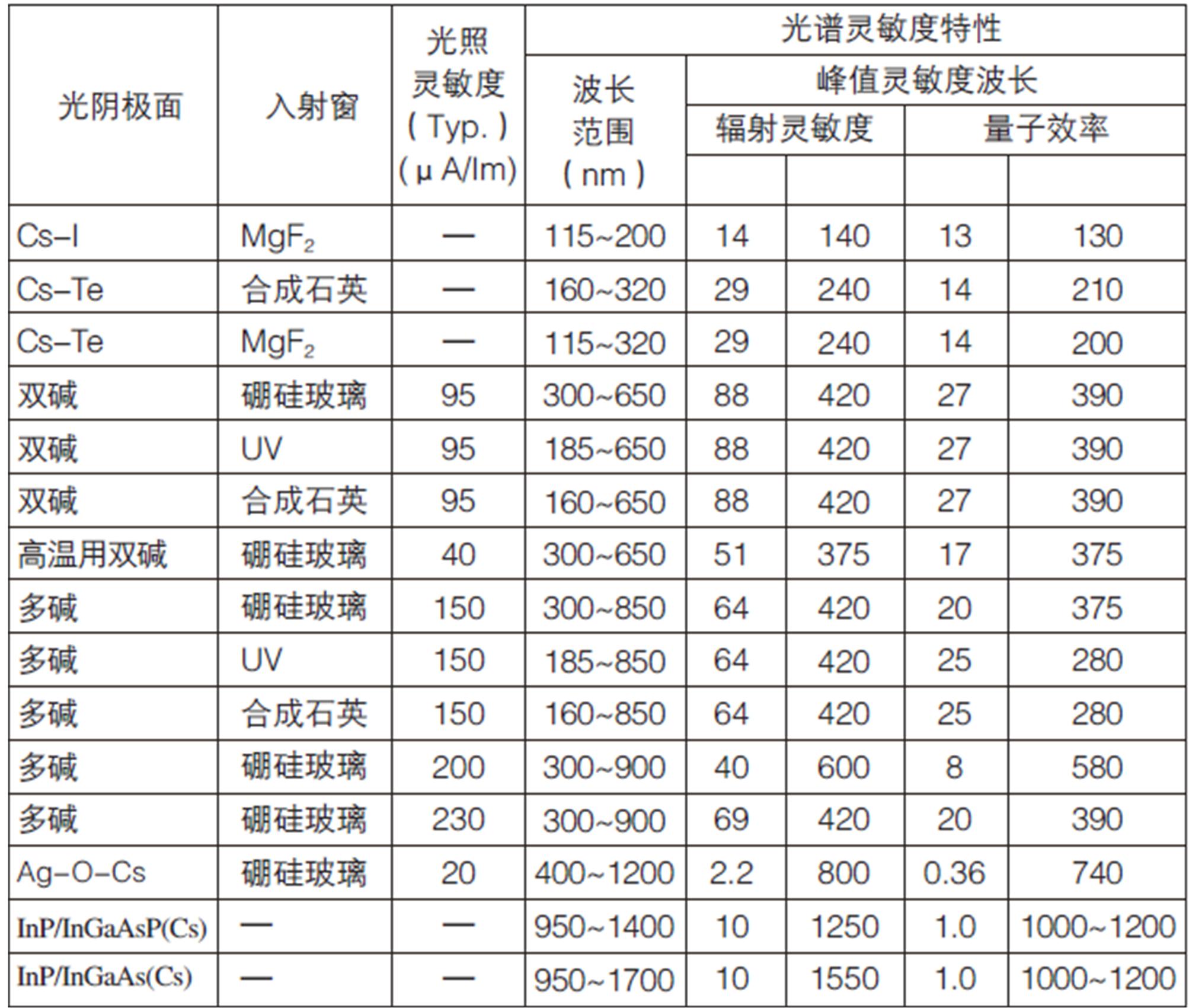 雖然PMT可探測(cè)光譜范圍很寬,但每一種管型可直接響應(yīng)的波段范圍是有限的,為使其探測(cè)效率得到充分利用,同時(shí)又不造成性能及成本的浪費(fèi),需要根據(jù)入射光的波長(zhǎng)選擇合適波段的PMT,如圖1所示。