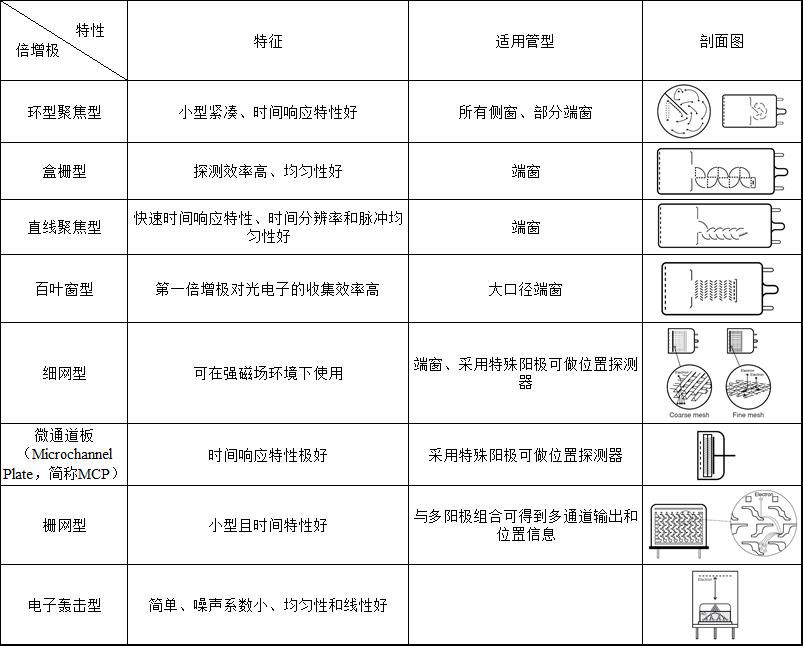 倍增有許多種類,由于其結(jié)構(gòu)、倍增的級(jí)數(shù)的不同而使得電流增益、時(shí)間響應(yīng)特性、均勻性、二次電子收集效率特性等不同,要根據(jù)使用目的做相應(yīng)的選擇。各倍增種類如表3所示。