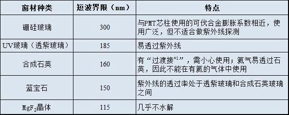 不同入射窗材料對(duì)紫外線的吸收特性有很大區(qū)別,這也決定了PMT光譜范圍的短波區(qū)界限,常用窗材如表1所示。