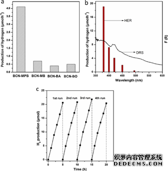 其中,BCN-MPB為納米片,這與其他三種產(chǎn)物不同(BCN-MB、BCN-BA、BCN-BO)。與塊體BCN相比,BCN-MPB具有更大的比表面積、更長的光生載流子壽命和更強(qiáng)的電子輸運(yùn)能力。因此,其在可見光輻射下具有增強(qiáng)的光催化產(chǎn)氫性能。